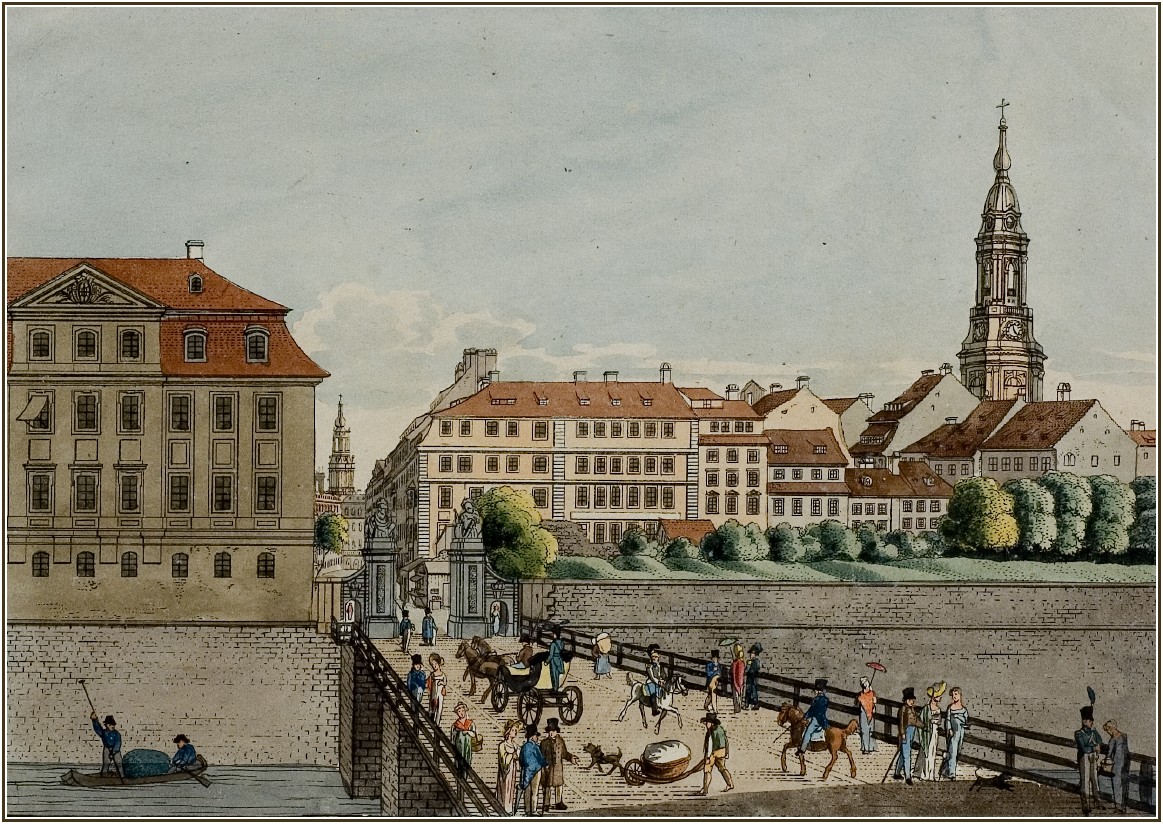 | "Das See-Thor zu Dresden, wie es vor der Demolierung 1812 war" Colorierter Kupferstich von C. F. Sprinck (Städtische Galerie Dresden). Dresden war damals noch von einem Wallring mit Festungsgraben umzogen und die Tore waren die Durchlässe. Von 1812 an wurden die Altstädter Gräben zugeschüttet und die Tore abgerissen. |