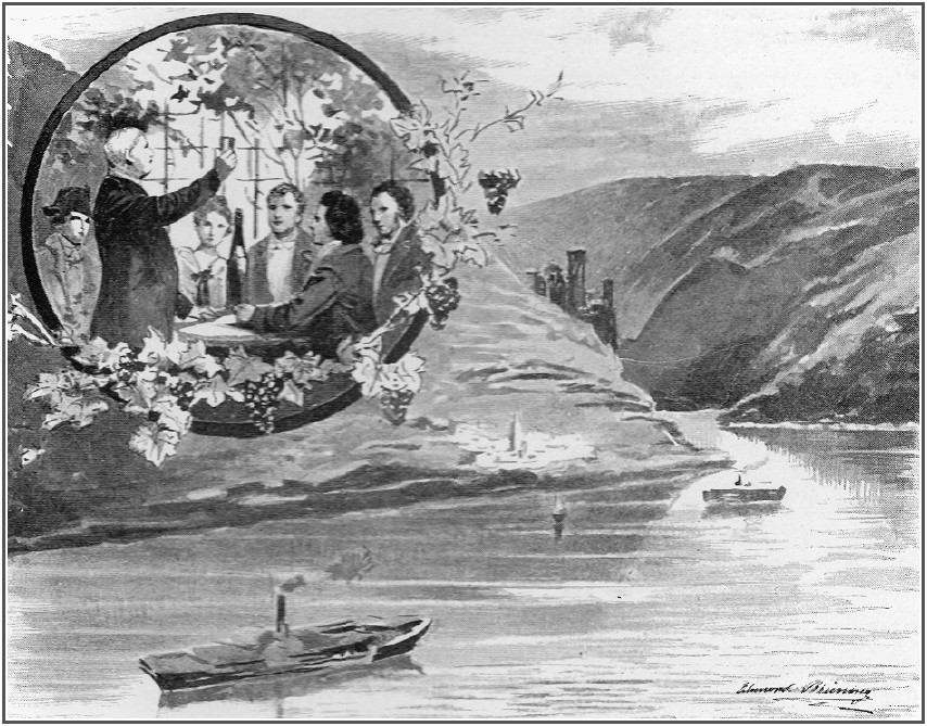 | ... wir sprangen geschwind auf das Schiff hinauf, der Schiffer gab das Zeichen, und so flogen wir nun im schönsten Morgenglanze zwischen den Bergen und Wiesen hinunter. Zeichnung von Edmund Brüning (1865-?). Leipzig 1898. - Das Dampfschiff ist zeitgerecht, die Landschaft aber ist eine am Rhein, nicht an der Donau. |