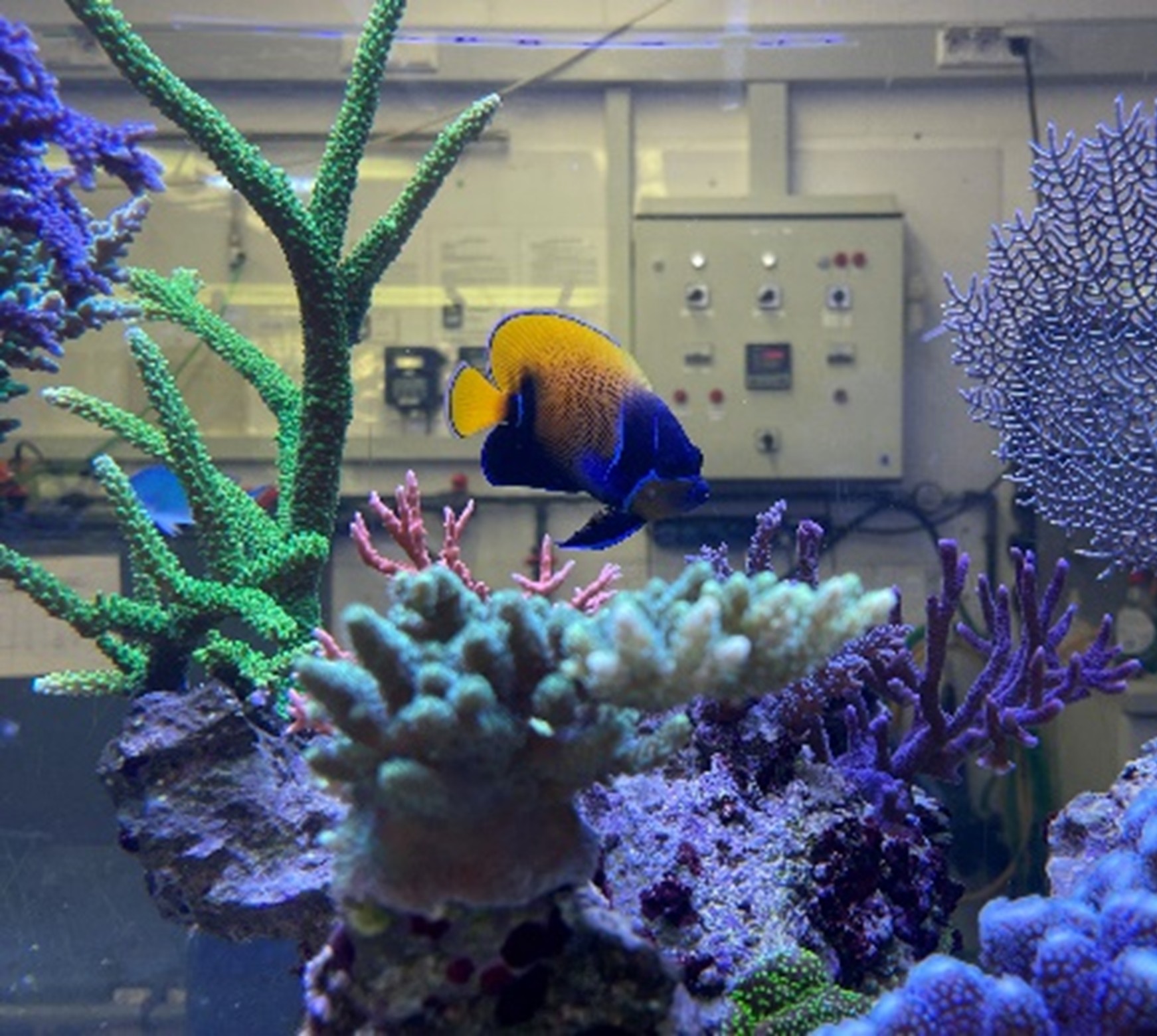 Klasse der Knochenfische Im Uni-Zoo lebt eine bunte Vielfalt an tropischen Meerwasserfischen, die typischerweise in und an Korallenriffen vorzufinden sind. Dabei erfüllt jedes Tier eine wichtige Aufgabe, wie zum Beispiel das Fressen von Algen oder Schädlingen. Im Uni-Zoo leben zum Beispiel der relativ selten gehaltene Traumkaiserfisch (Paracanthurus navarchus) oder der Samtdoktorfisch (Acanthurus nigricans), welcher am Schwanzansatz ein sogenanntes Skalpell zur Verteidigung besitzt. |