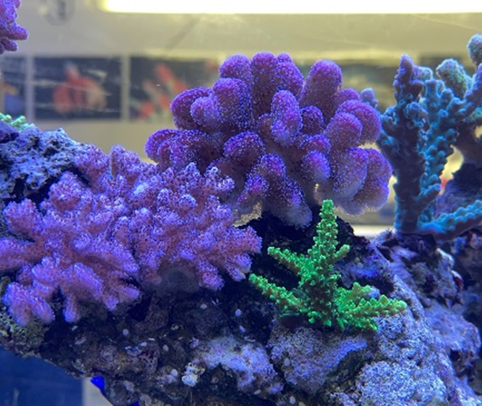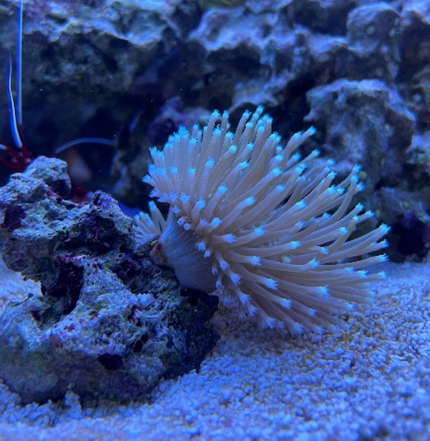Steinkorallen Steinkorallen gehören zu der Klasse der Blumentiere und bilden ein Kalkskelett, welches mitunter den Hauptbestandteil eines Korallenriffs ausmacht. Bei näherem Betrachten lässt sich feststellen, dass eine Koralle aus tausenden Einzelpolypen besteht. Dabei ist jeder Polyp ein einzelnes Tier. Steinkorallen leben oft in einer Symbiose mit Zooxanthellen. Diese besonderen Algen betreiben Photosynthese und ermöglichen der Koralle so ein schnelleres Wachstum. Bei uns zu finden sind unter anderem Geweihkorallen (Acropora spp.), Himbeerkorallen (Pocillopora damicornis) und Flötenkorallen (Caulastrea curvata). |