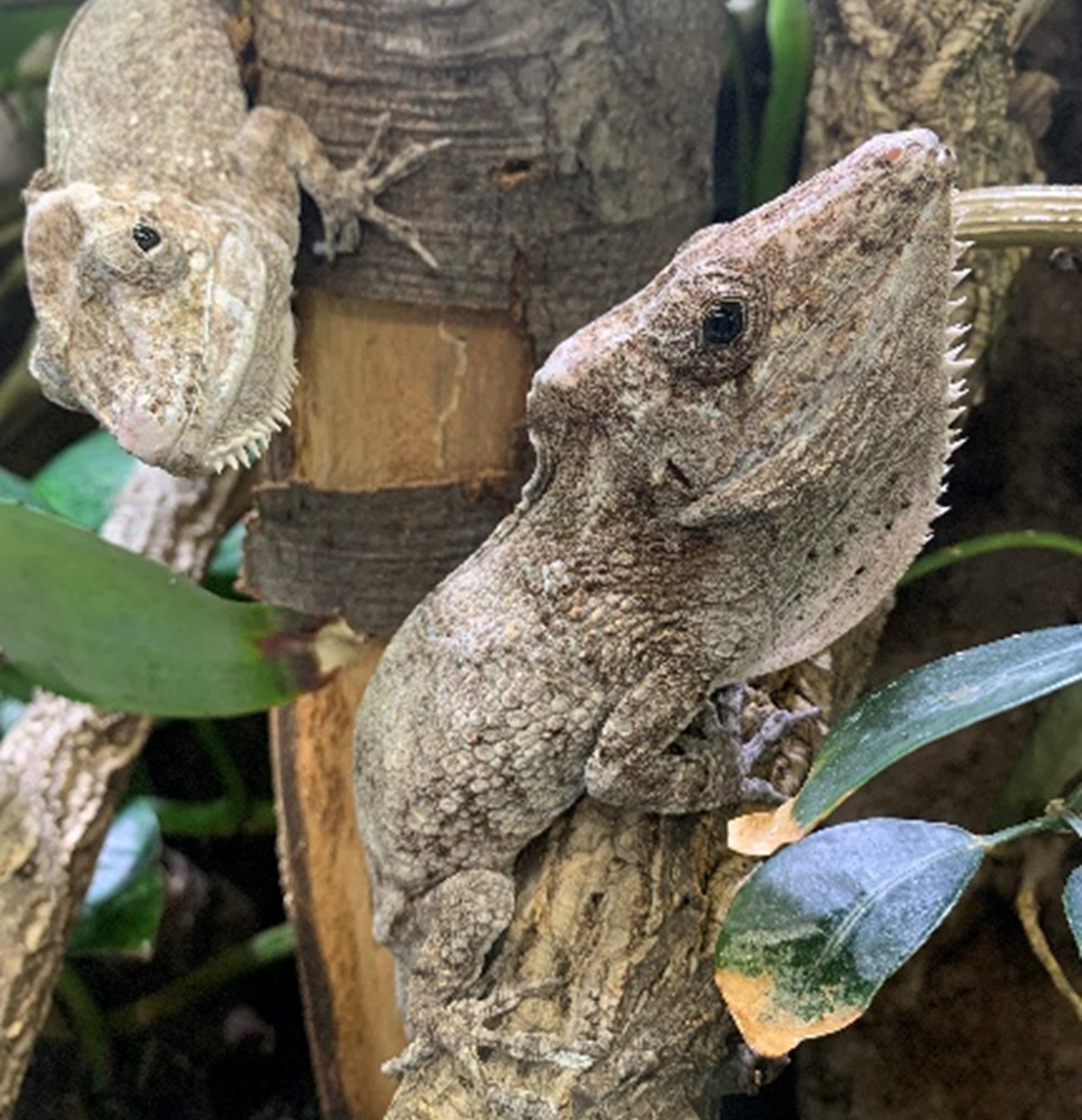 Familie der Anolis Obwohl der Bartanolis (Anolis barbatus) häufig als Kubanisches Chamäleon bezeichnet wird, ist er nicht näher mit den Chamäleons verwandt, sondern ein Kleinleguan aus der Familie der Anolis. Beheimatet ist der Bartanolis auf Kuba, wo er in den Baumwipfeln der Wälder lebt und, perfekt getarnt, meist an der gleichen Stelle verharrt. Bartanolis bewegen sich nur, um zu fressen, vor Prädatoren zu fliehen oder mit Artgenossen zu interagieren. Weitere Vertreter dieser Familie im Uni-Zoo sind der Rotkehl- (Anolis carolinensis) und der Leopardanolis (Anolis marmoratus girafus). |